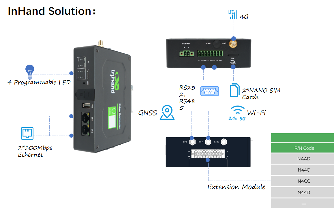 InHand EC312 Industrial Cellular Modem — supports stable 4G/5G connectivity, RS232/485 interfaces for sensor connection, industrial-grade durability (resists extreme temps/vibration), and secure data transmission.