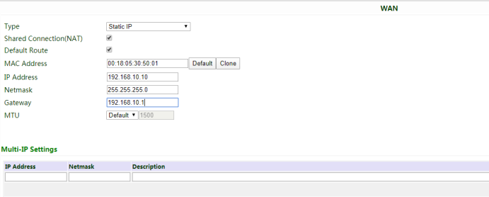 1. Go to Network >> WAN.We select Static IP for the WAN connection, and configure the WAN portas follows: