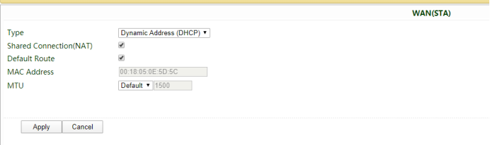 1) Go to Network >> WAN(STA), selectDHCP for WLAN connection.