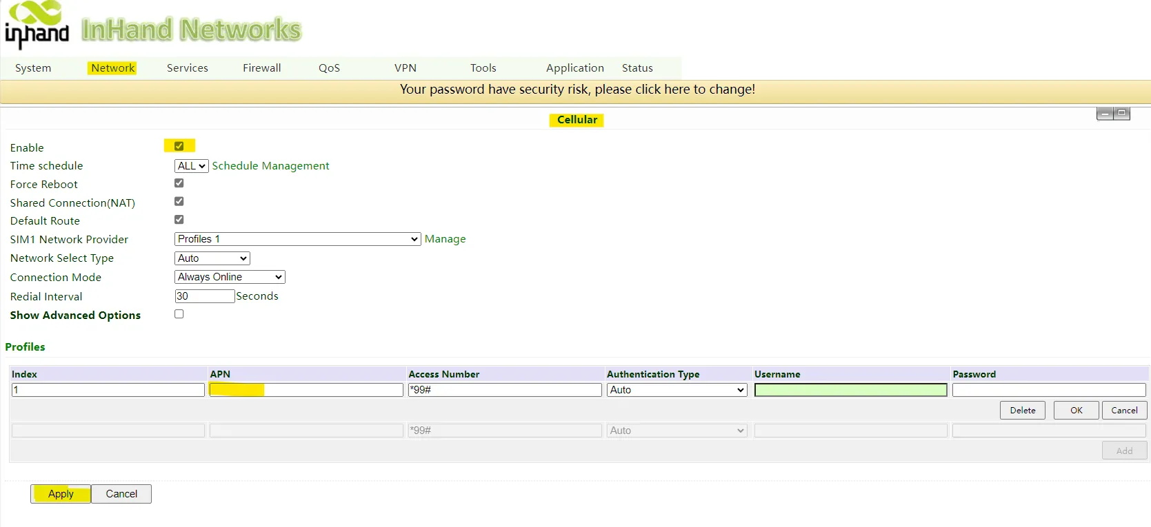 Please go to Network-->Cellular, Enable it. Set the SIM1 Network Provider to Profile1, fill in APN if the ISP offers special APN. Other parameters can keep default. Then hit the Apply button.
