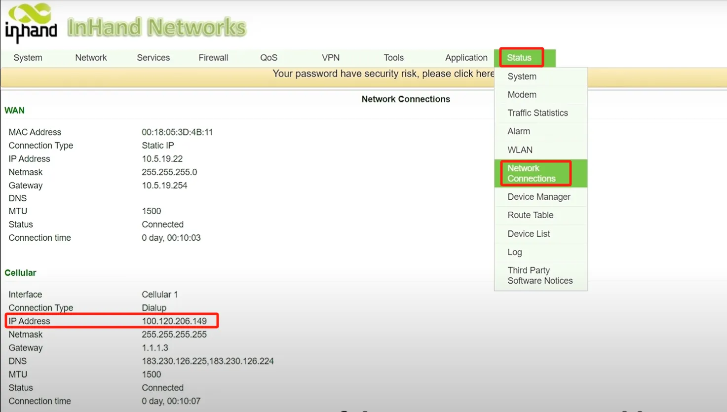 Navigate to Status—>Network Connections, to see if the router gets an IP address.