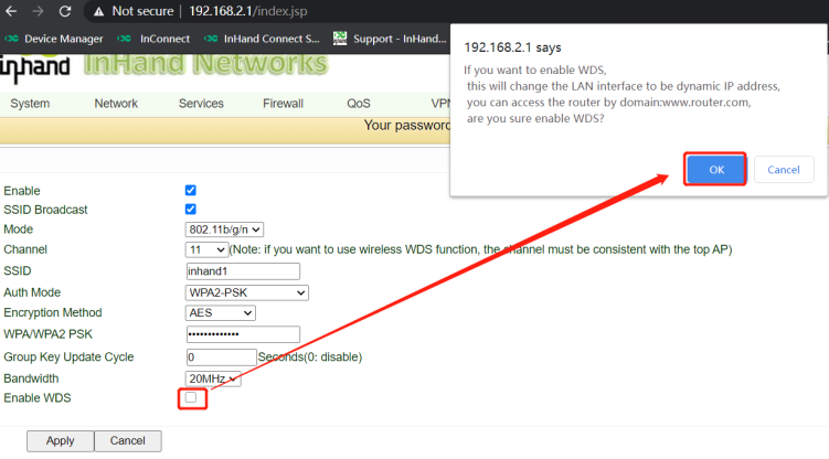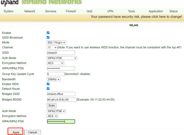 3) Enable WDS. Configure the same channel as the AP device, change the SSID different from the AP device, and select a encryption method.
