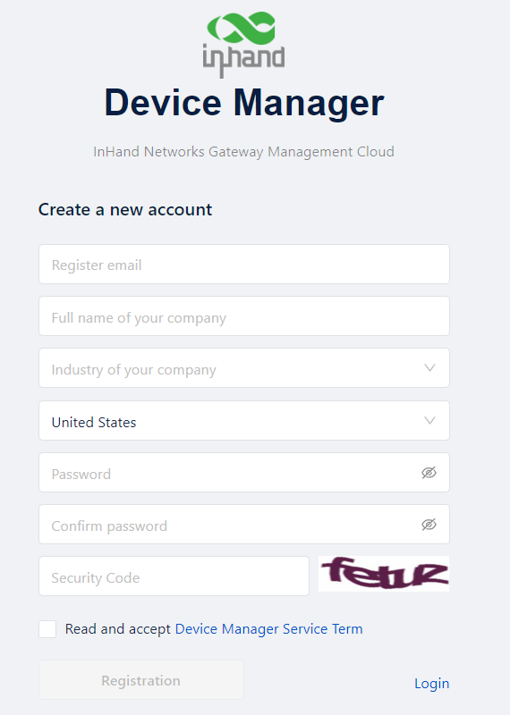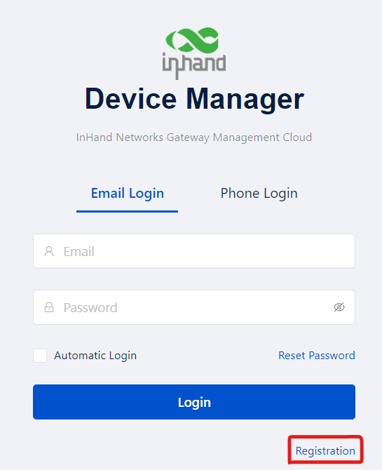 1.Type the url in the browser: https://iot.inhandnetworks.com/. Please click the Registration to create an online portal account.