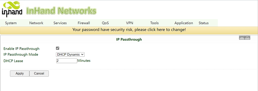 Note 1: Before setting up IP Passthrough, the router must be receiving a public IP from the carrier. In order to test this, go to Status>Network Connections. Under Cellular/Dialup>IP address, input that IP address into a new tab/window on the browser and if it reaches the router login page, then that means IP Passthrough can allow remote connection to the end device.
