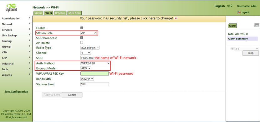 3. Change the Station Role to AP. Change SSID if needed. Change Auth Method to WPA2-PSK. Change Encryption to AES. Change WPA/WPA2 PSK to what you want the password to be (8 character minimum). Hit Apply & Save.