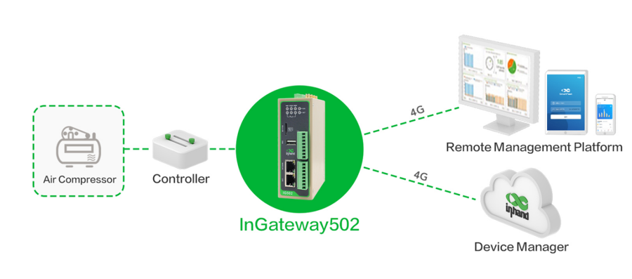 Connect InGateway502 to air compressor controllers to collect pressure, temperature, runtime, and fault codes.