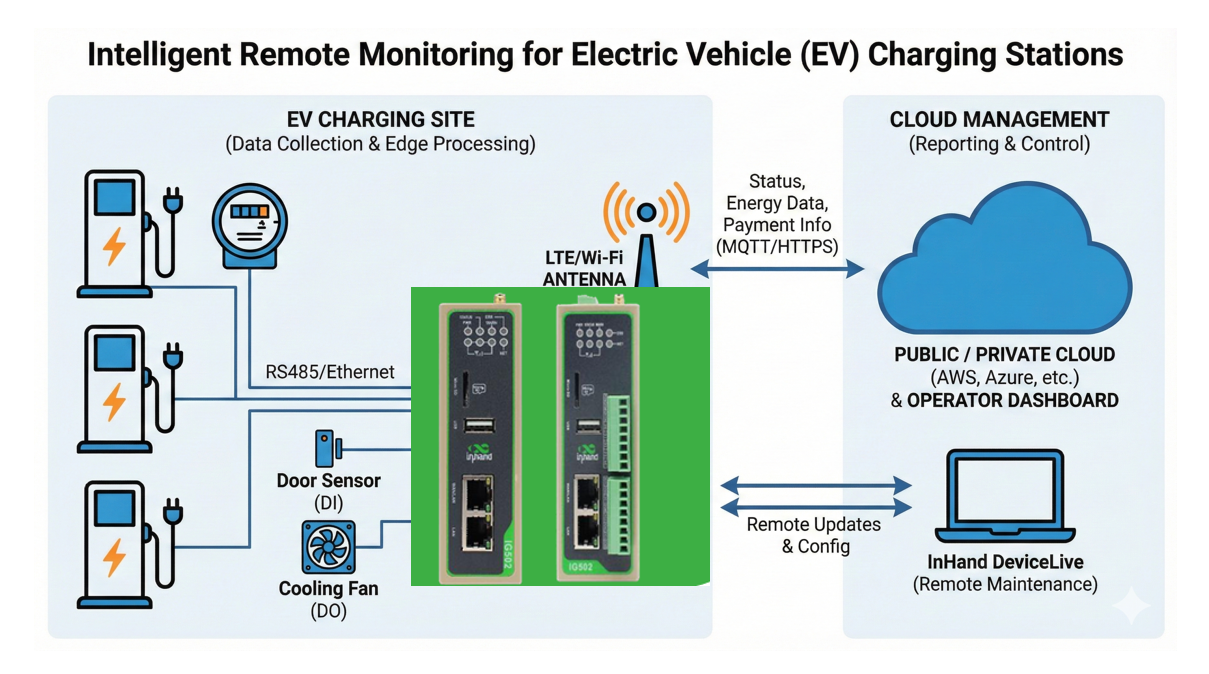 With the rapid expansion of electric vehicle infrastructure, charging station operators face the challenge of managing geographically dispersed chargers from multiple manufacturers. These stations are often located in outdoor environments and require constant connectivity to process payments, monitor equipment health, and manage energy loads. The IG502 serves as a rugged, high-performance edge computing gateway that connects the station hardware to the centralized management cloud.