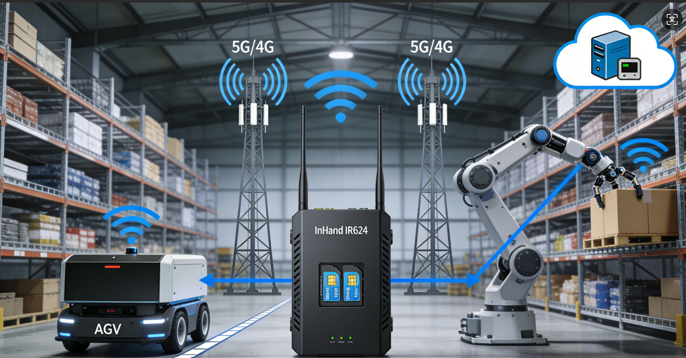InHand IR624 Industrial 5G Router — features ultra-low-latency 5G connectivity, Dual SIM redundancy, edge computing capabilities, and industrial-grade durability (wide temperature range, anti-interference design), ideal for dynamic warehouse environments.