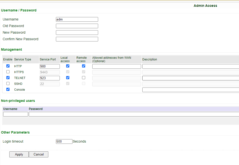 Default HTTP is 80, HTTPS 443, Telnet 23. Change the values of these Service ports or disable the port for Remote Access. Hit apply when done.