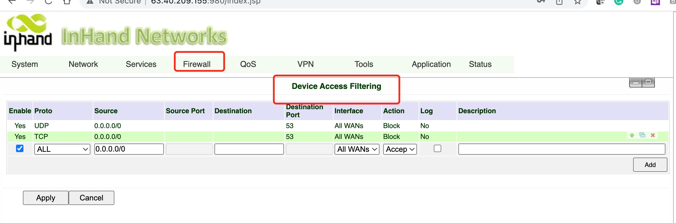 Go to Firewall>>Device Access Filtering, and add following firewall rules.