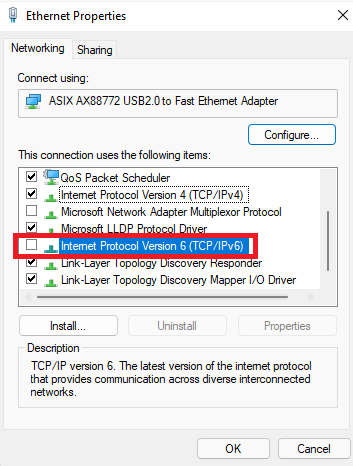 3. In the same Ethernet Adapter properties in Windows, uncheck Internet Protocol Version 6 (TCP/IPv6), the adapter could be set to IPv6.