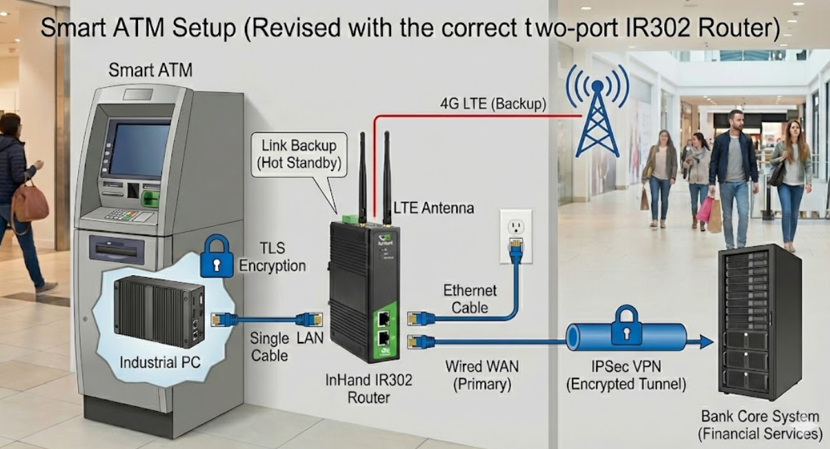 The InHand IR302 Industrial Router is installed inside the ATM cabinet to serve as the secure communications gateway, utilizing its specific "Industry Application" features designed for financial services.