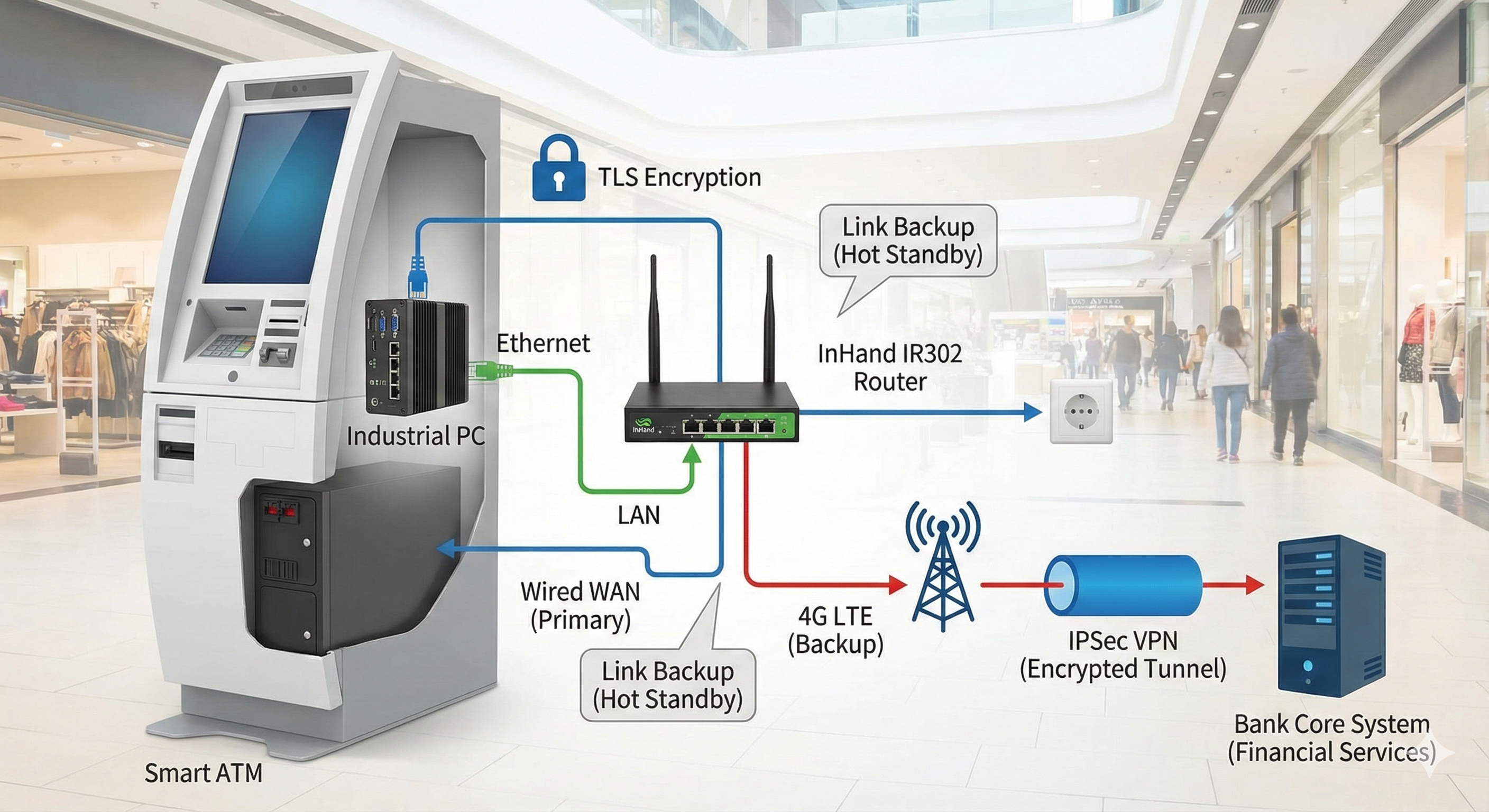 Transaction Reliability: Redundant link backup ensures customers can always withdraw cash, protecting the bank's reputation.