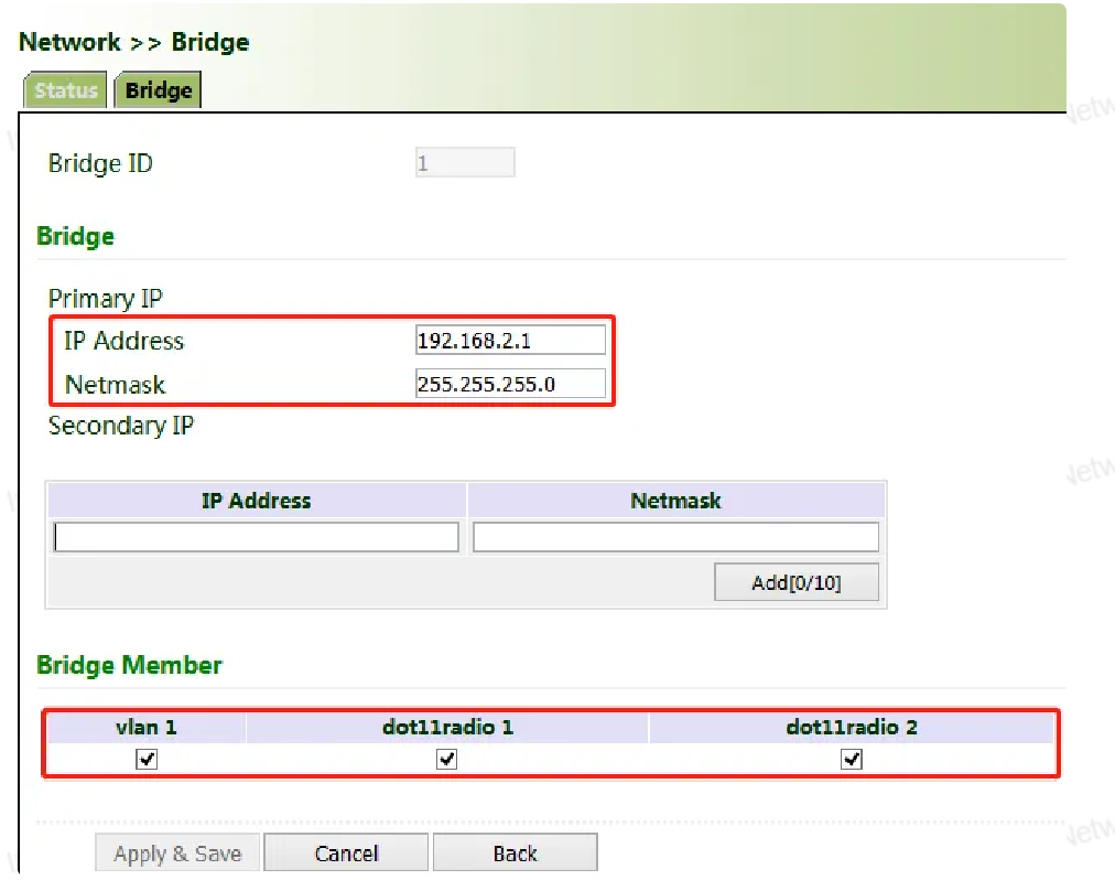 2. Modify the IP address of the bridge port or bridge members. Among the bridge members, dot11radio1 and dot11radio2 are Wi-Fi 2.4G and Wi-Fi 5G ports respectively.