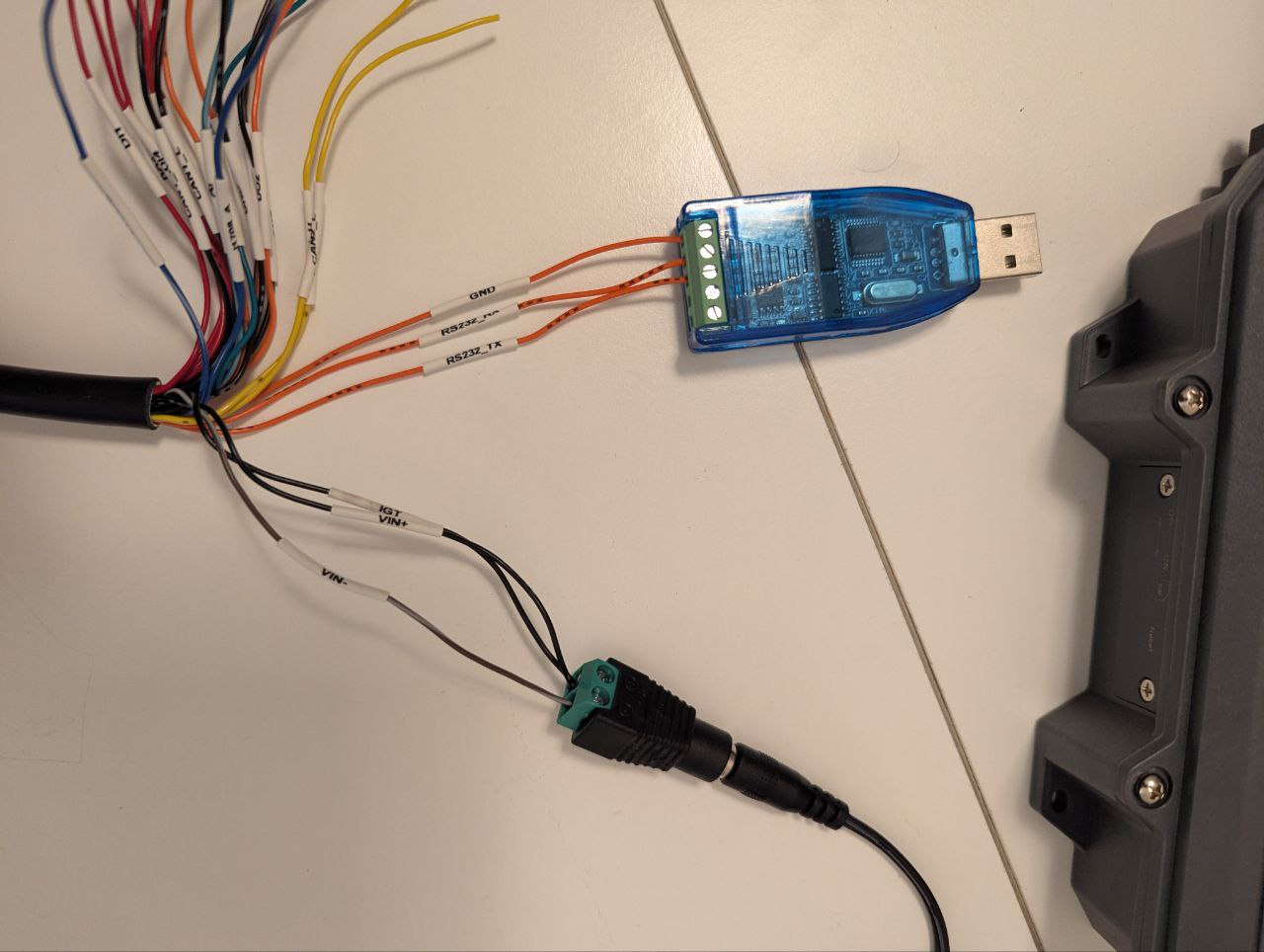 Power the VT device using an external adapter via the 26-pin all-in-one test cable. Connect the VT to your computer using a USB-to-Serial cable.