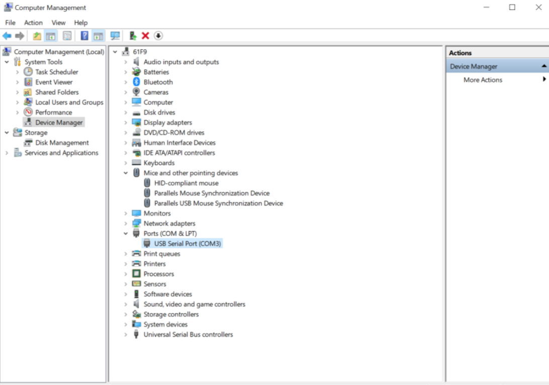 Open Device Manager on your computer. Expand the "Ports (COM & LPT)" section and verify that the USB-to-Serial adapter is recognized and assigned a COM port number (as shown below).