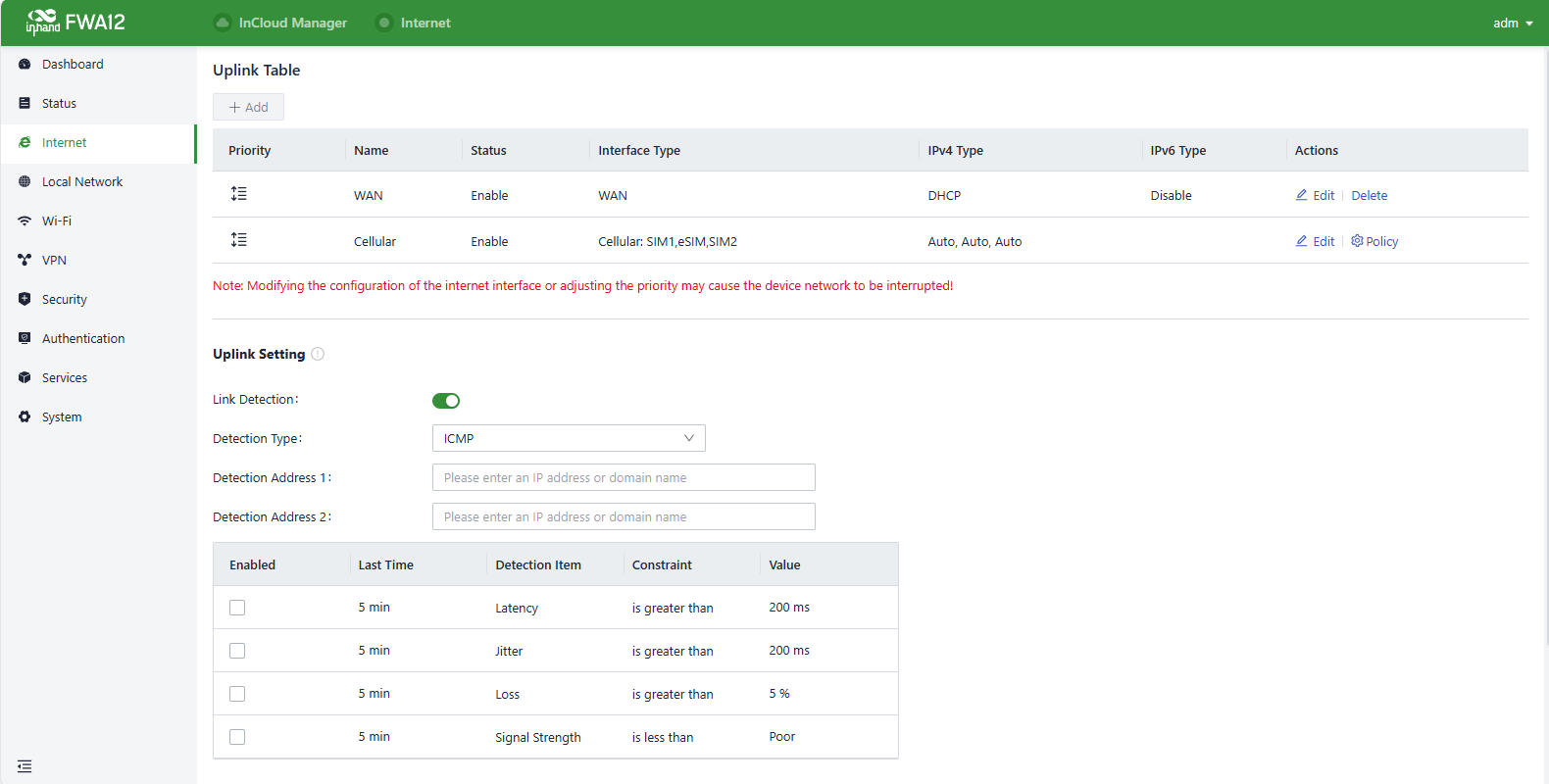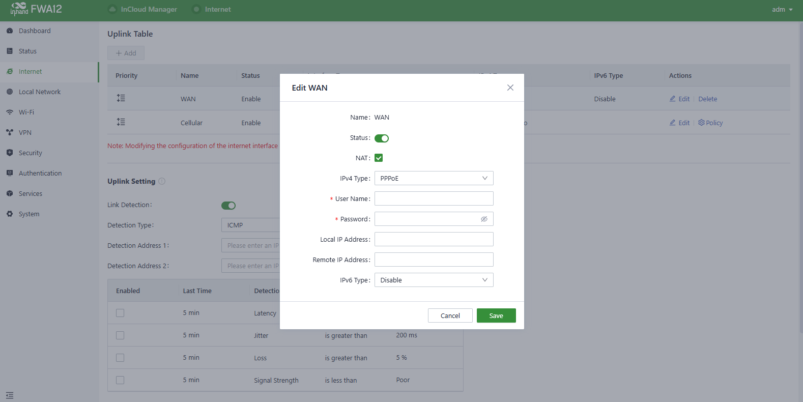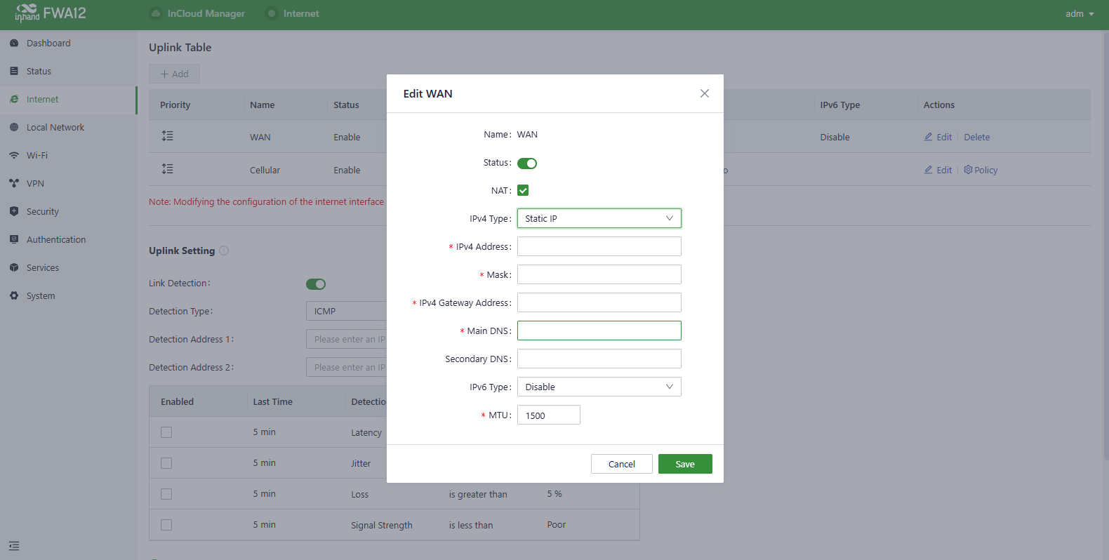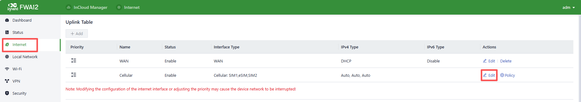 3. If this device cannot connect to a network, click “Internet〉Uplink Table〉Edit ” to set up network parameters. The device enables the dial-up function and WAN by default, please wait for a few minutes to go online, and re-enable the dial-up if it is not dialled.