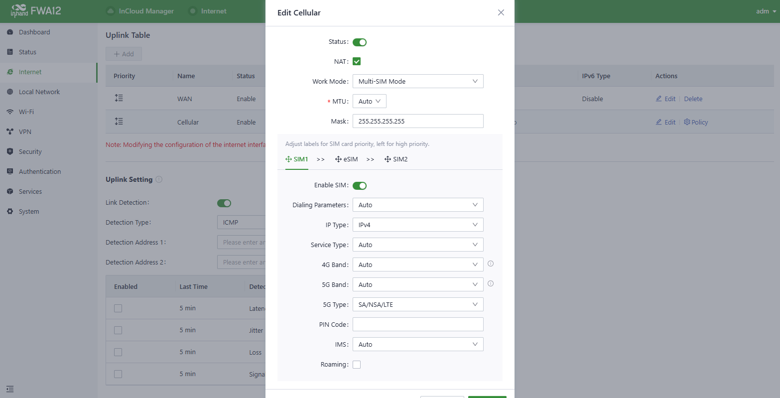 3. Go to the "Internet" section in the left navigation bar. Click the "Edit" button next to the "Cellular" option to configure the dial-up parameters. The device comes with the dial-up function enabled by default. If it doesn't establish a connection within a few minutes, re-enable the dial-up option.