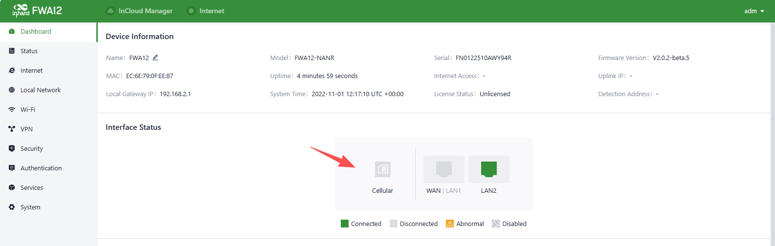 4. To verify the dial-up status, go to the "Interface Status" section located in the "Dashboard." The device has successfully connected to the Internet when the "Cellular" icon turns green. You can click on the "Cellular" icon to access information like signal strength, IP address, and data usage.