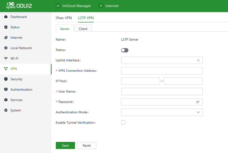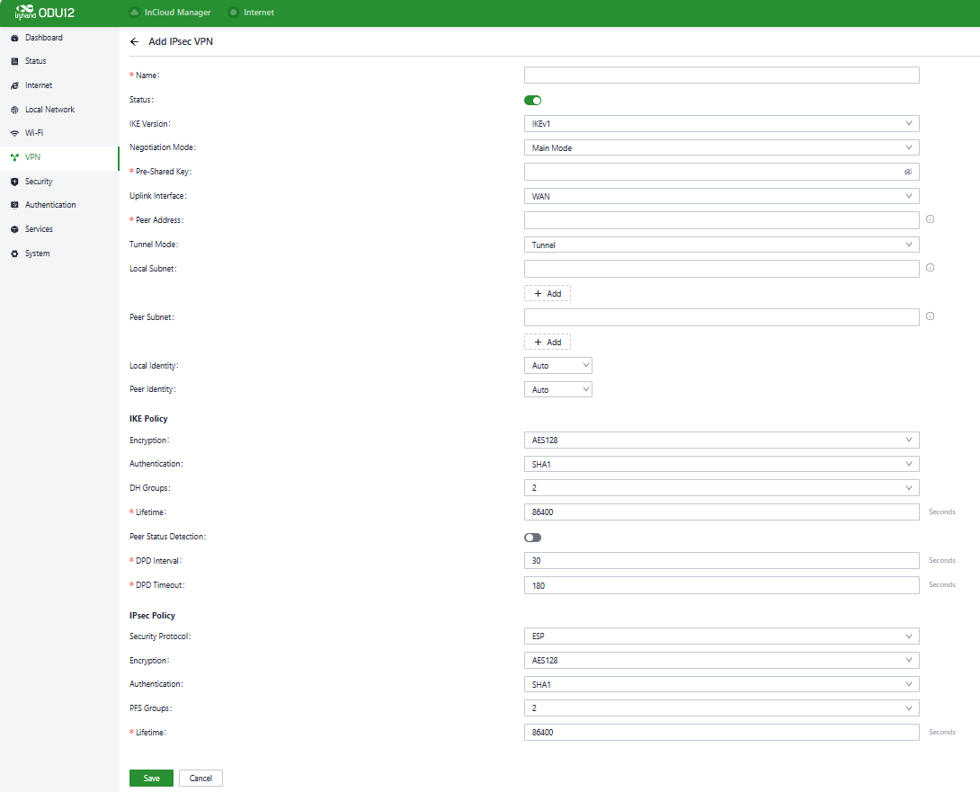 Notes: The peer IP address must be set to 0.0.0.0 if working as an IPSec server.