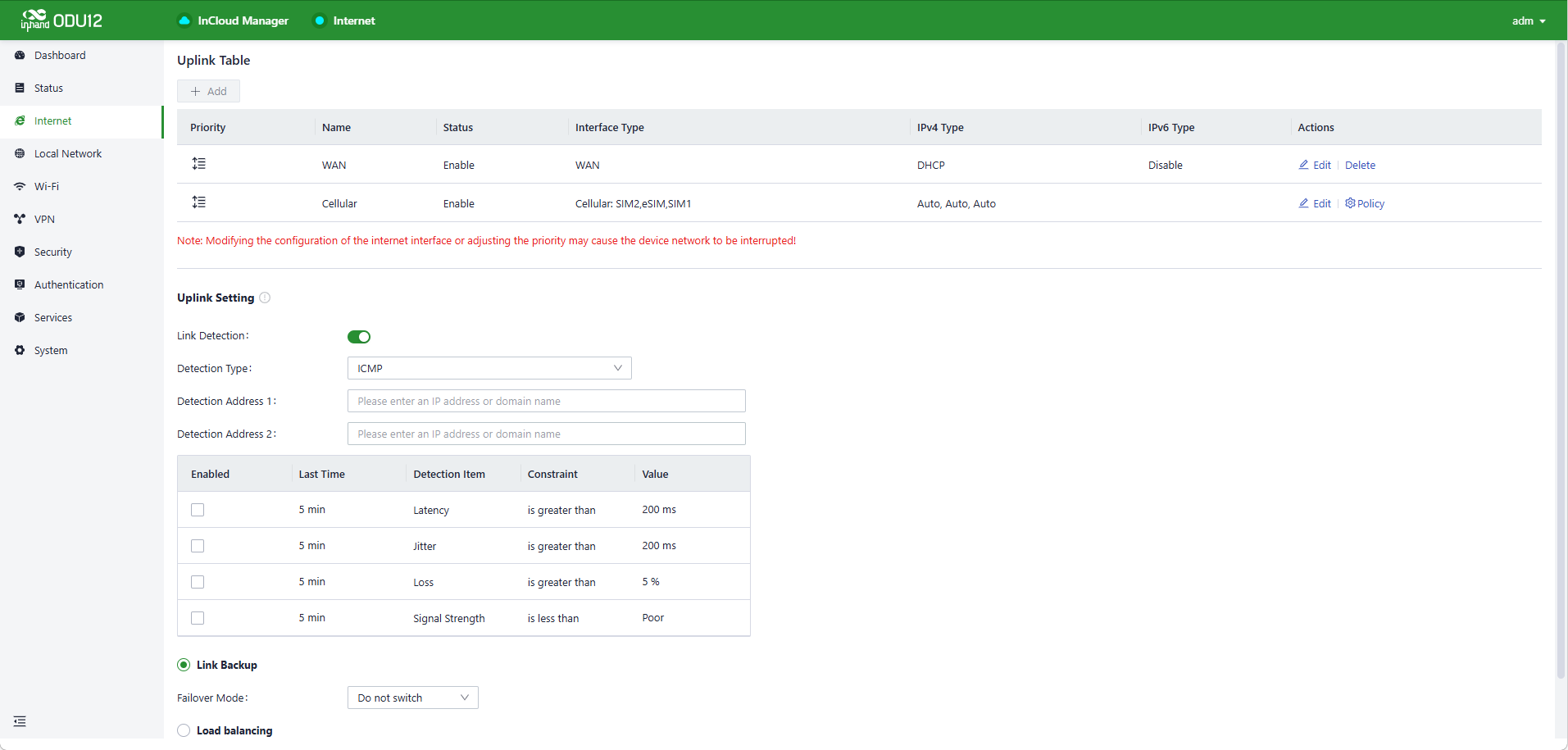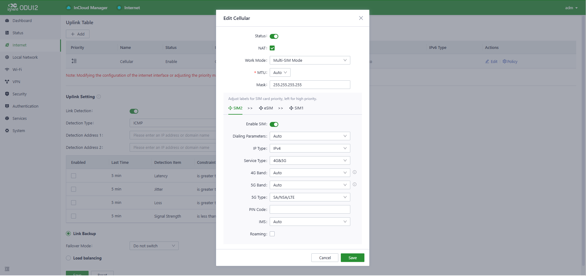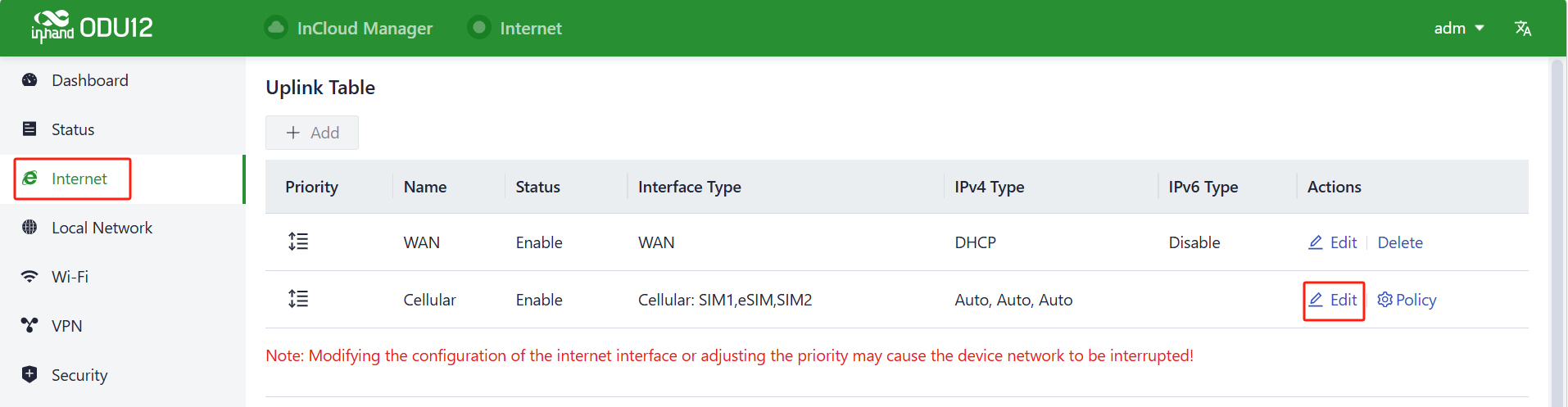 Step 5: If ODU cannot connect to a network, click "Internet" on the left navigation bar, and click the edit button behind the "Cellular" or “WAN” to set up network parameters. The device enables the dial-up function and WAN by default, please wait for a few minutes to go online, and re-enable the dial-up if it is not dialled.