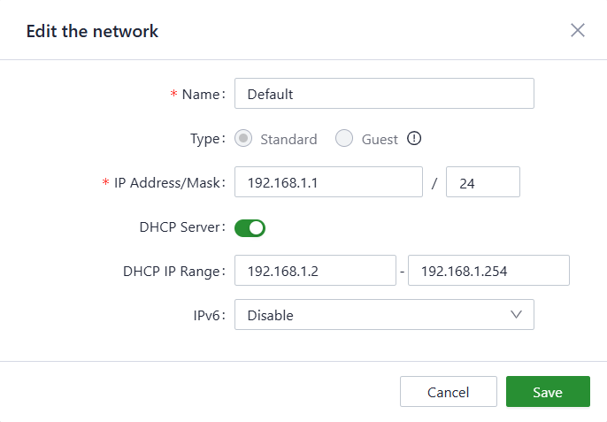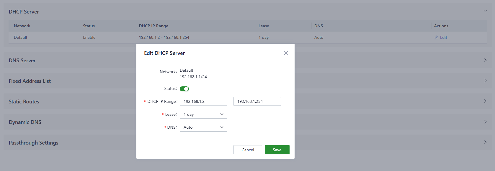 Edit the network: Click the Edit button on the right to edit LAN IP, enable/disable the DHCP server and change the range of DHCP address.