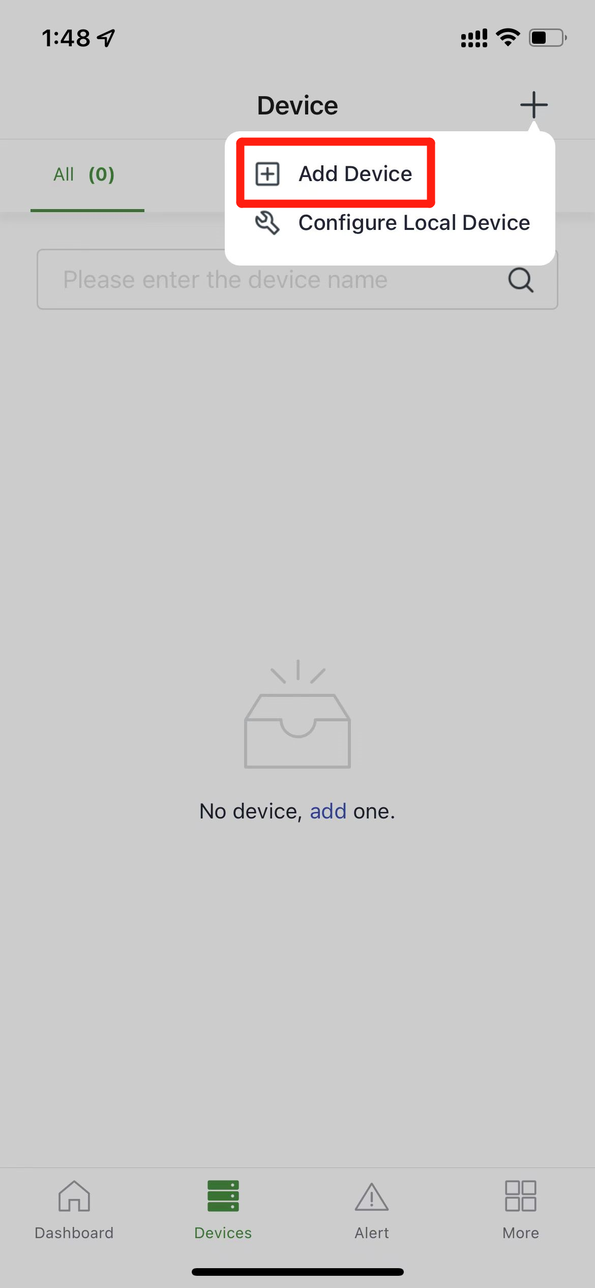 Step 2: Click the "Device" directory below to enter the [Device] page, click the menu button in the upper right corner, and select [Add Device]. Scan the QR code on the ODU to add a device.