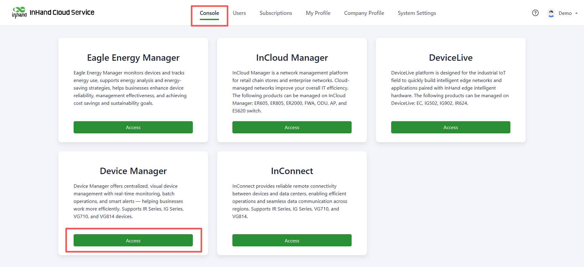 Scenario: When you are already logged in to the InHand Cloud Service and need to access Device Manager or InConnect.