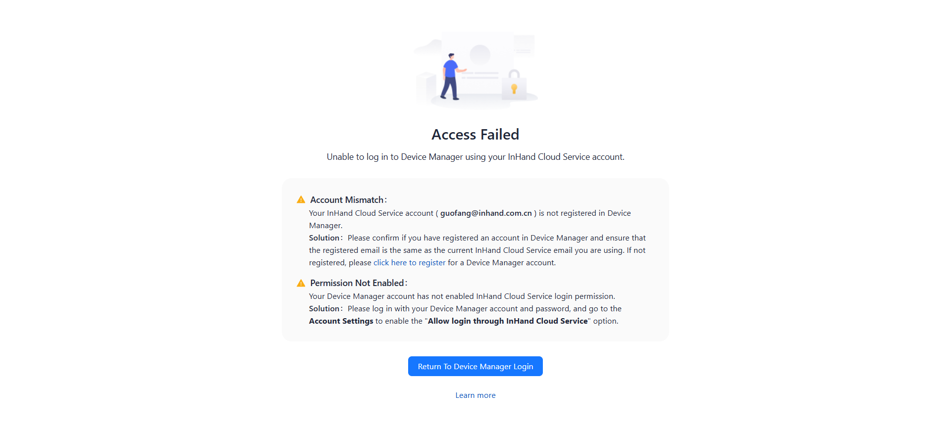 - Make sure the email account you use in InHand Cloud Service is also registered in Device Manager or InConnect.If not, please register first in the corresponding platform.