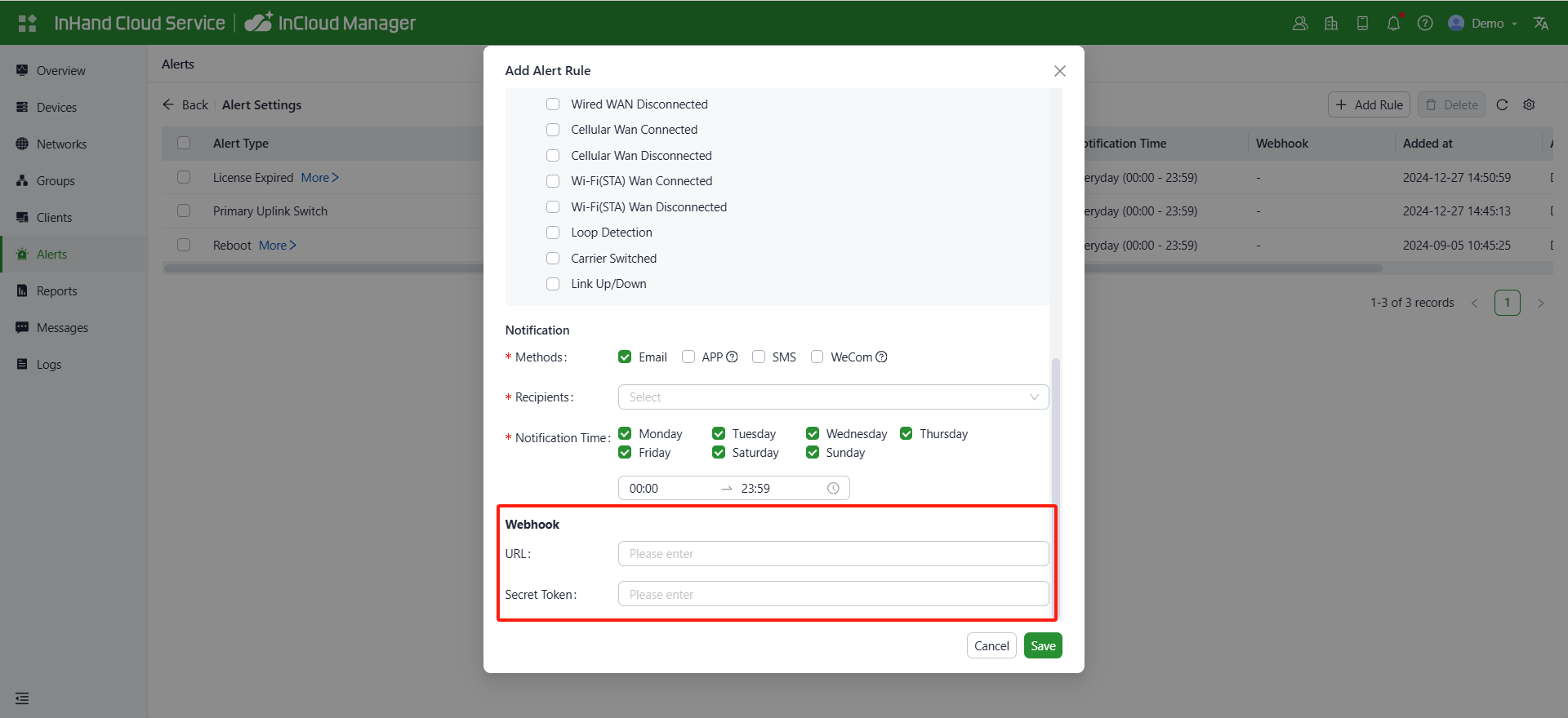 InCloud Manager provides Webhook functionality to help you receive alert notifications in real-time.
