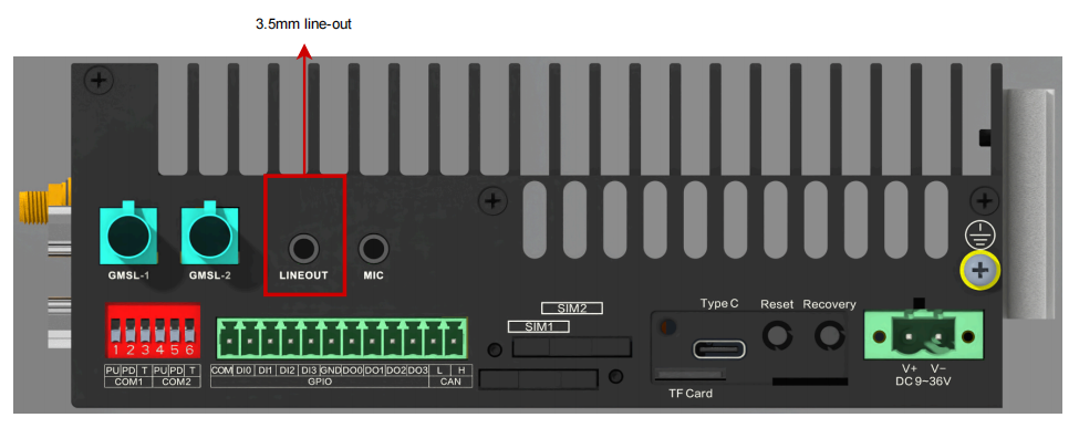 The device has 1 Line-out connector on the right panel, which supports 3.5mm standard audio output.
