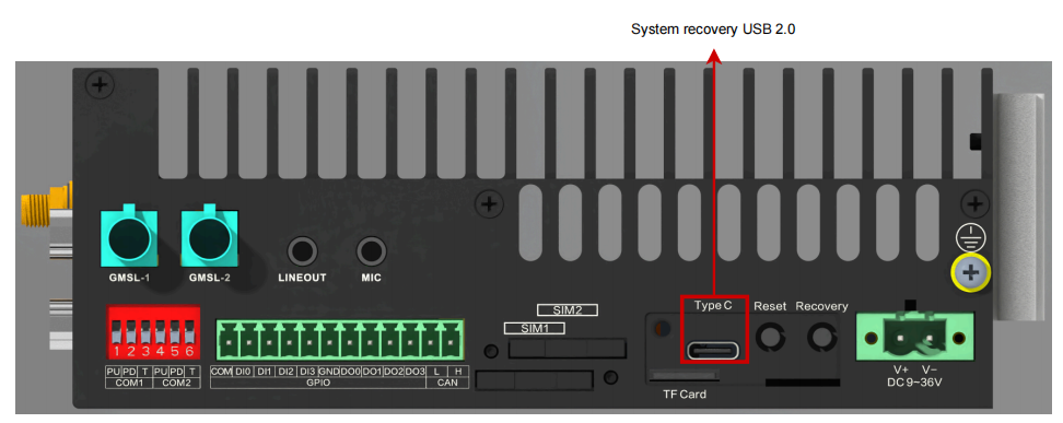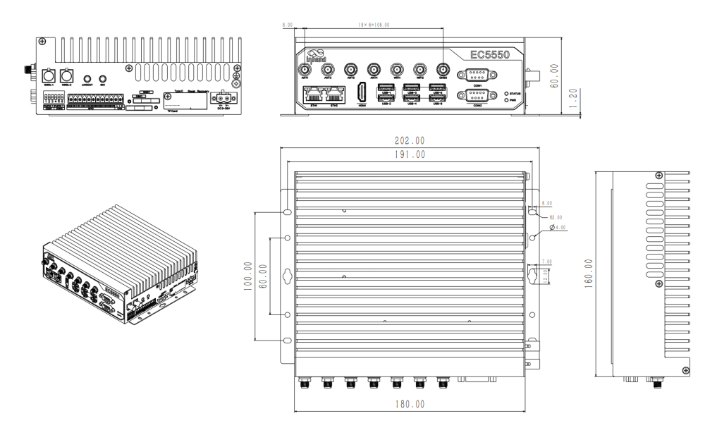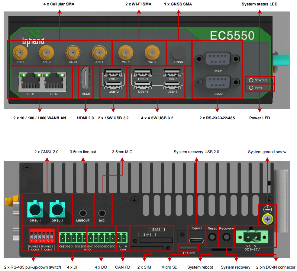 The EC5000 comes pre-integrated with NVIDIA® Jetson Orin NX™ or Orin Nano™, making it ideal for industrial AI applications.The EC5000 design includes 2 Gigabit LAN ports, 1 HDMI video display, 6 external USB 3.2 ports, 2xRS-232/RS-422/RS-485, 1 power indicator, 1 system status light, 2 GMSL video interfaces, 4 DI, 4 DO, 1 CAN FD, 2 SIM card slots, 1 USB Type C for system burn-in, 1 TF card slot, 1 reboot (hardware watchdog enable) button, 1 restore mode button, and 1 linear output connector and microphone connector.