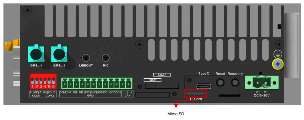 The device has a TF card slot under the removable baffle on the right panel, which supports Micro SD memory cards. When there is a need for additional storage space, please insert a Micro SD card with a capacity of at least 8GB into this card slot for subsequent use.