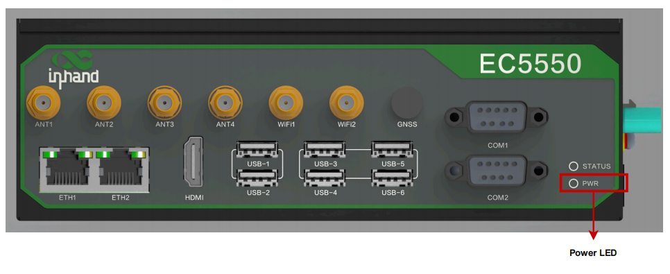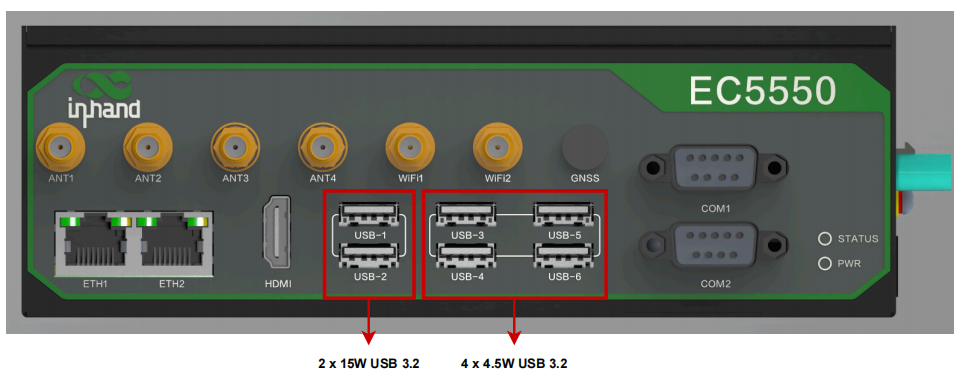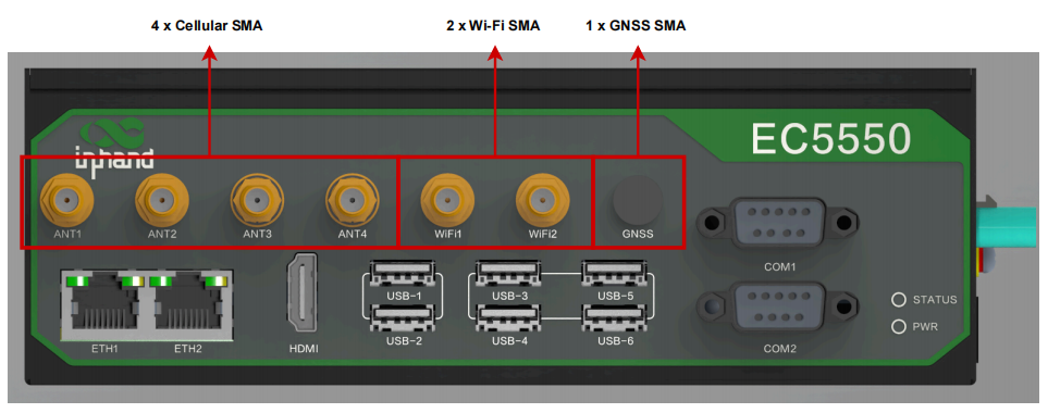 The front panel of the device provides up to seven SMA connectors. Different models are equipped with different types and numbers of 4G/5G/Wi-Fi/GNSS antennas. Users can select equipment according to their own needs. For the support status of antennas of specific models, please refer to the "Ordering Guide" section in the "EC5000 Series Edge AI Computer Product Specification".