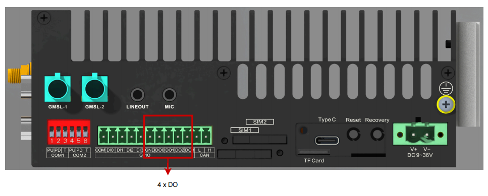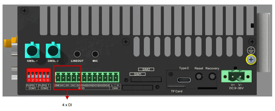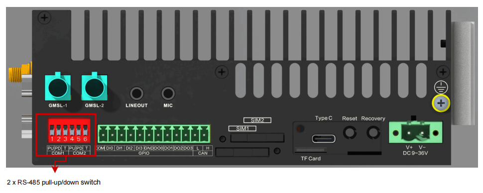 The device has 1 RS-485 pull-up and pull-down dip switches on the right panel to control the pull-up and pull-down resistors of the RS-485 bus (corresponding to COM1/COM2).