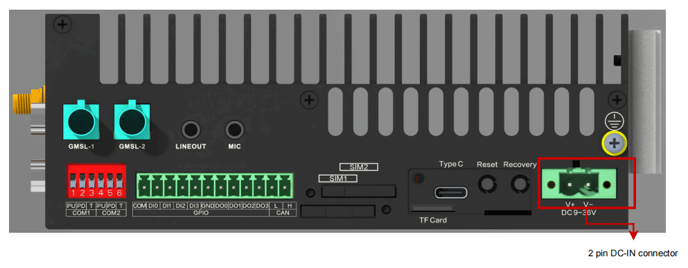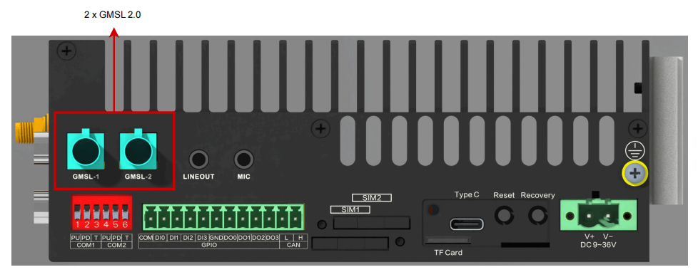The device has 2 GMSL 2.0 ports on the right panel, supporting docking of 2 GMSL cameras.