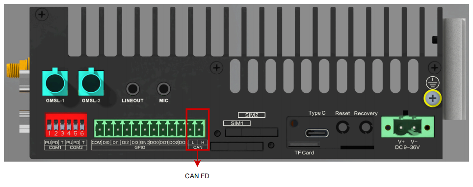 The device has 1 CAN FD interface (on-board 120Ω resistor) on the right panel, supporting a maximum communication rate of 5Mbps.