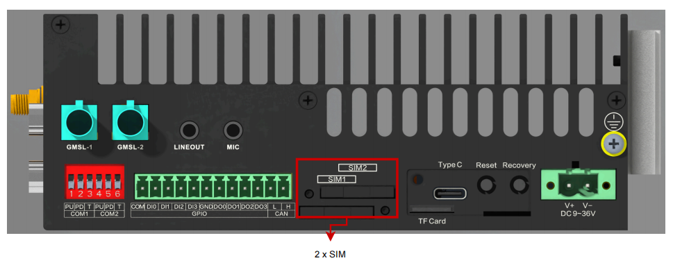 The device has 2 SIM card slots (SIM1/SIM2) on the right panel to support standard SIM cards, please insert at least 1 available SIM when using the cellular function.