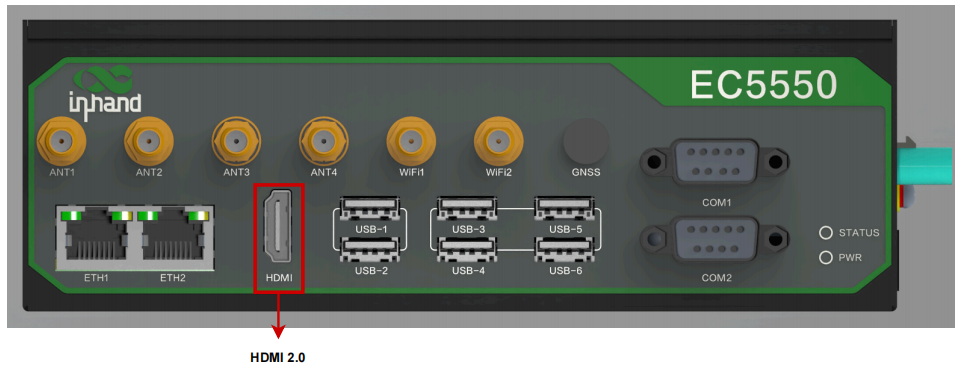 The device provides a Type-A HDMI 2.0 connector on the front panel for external screens. The maximum resolution is 3840 x 2160 @60Hz.