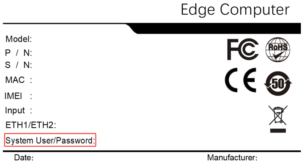 Connect the device to the monitor via the HDMI 2.0 port, plug the keyboard and mouse into the USB 3.2 port of the device, power up the device and wait for the device to finish booting. Check the nameplate on the bottom of the device to find the default system username and password.