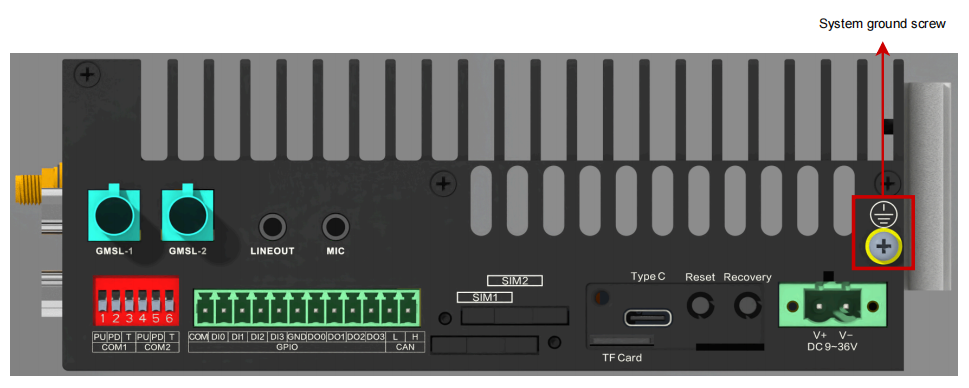 There is 1 system grounding screw on the right panel of the equipment, please use a green-yellow grounding wire (16AWG) and ground it with the system grounding screw.