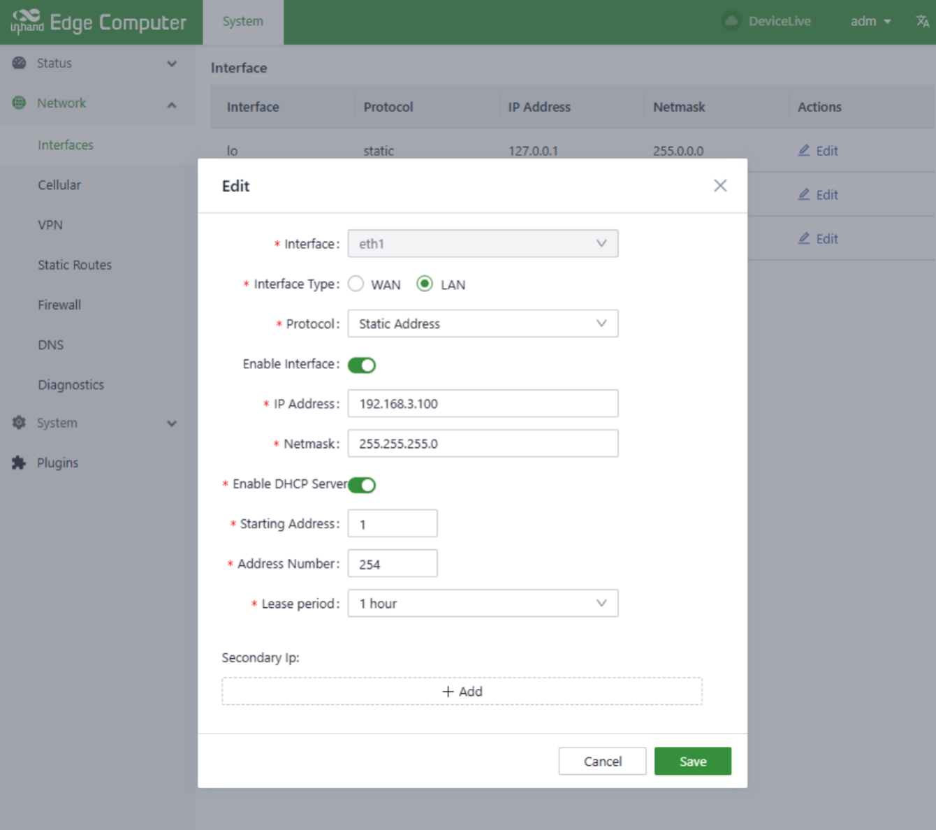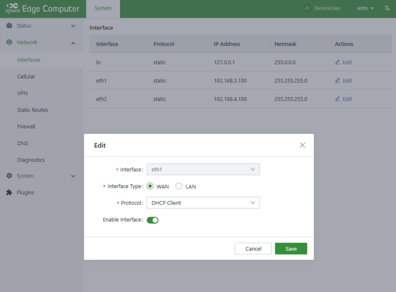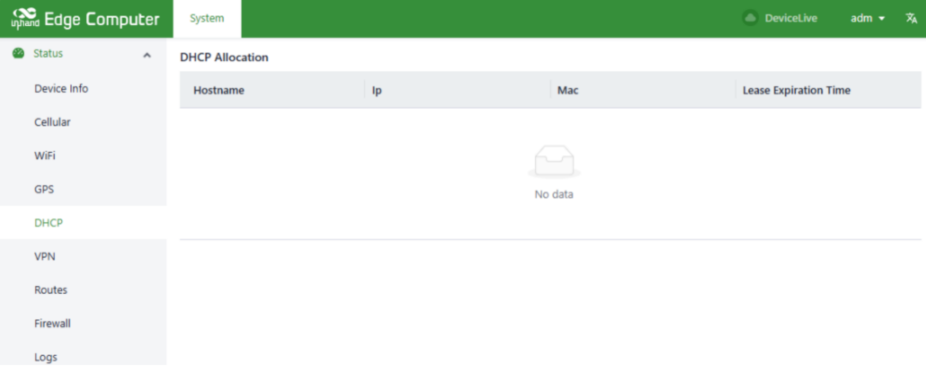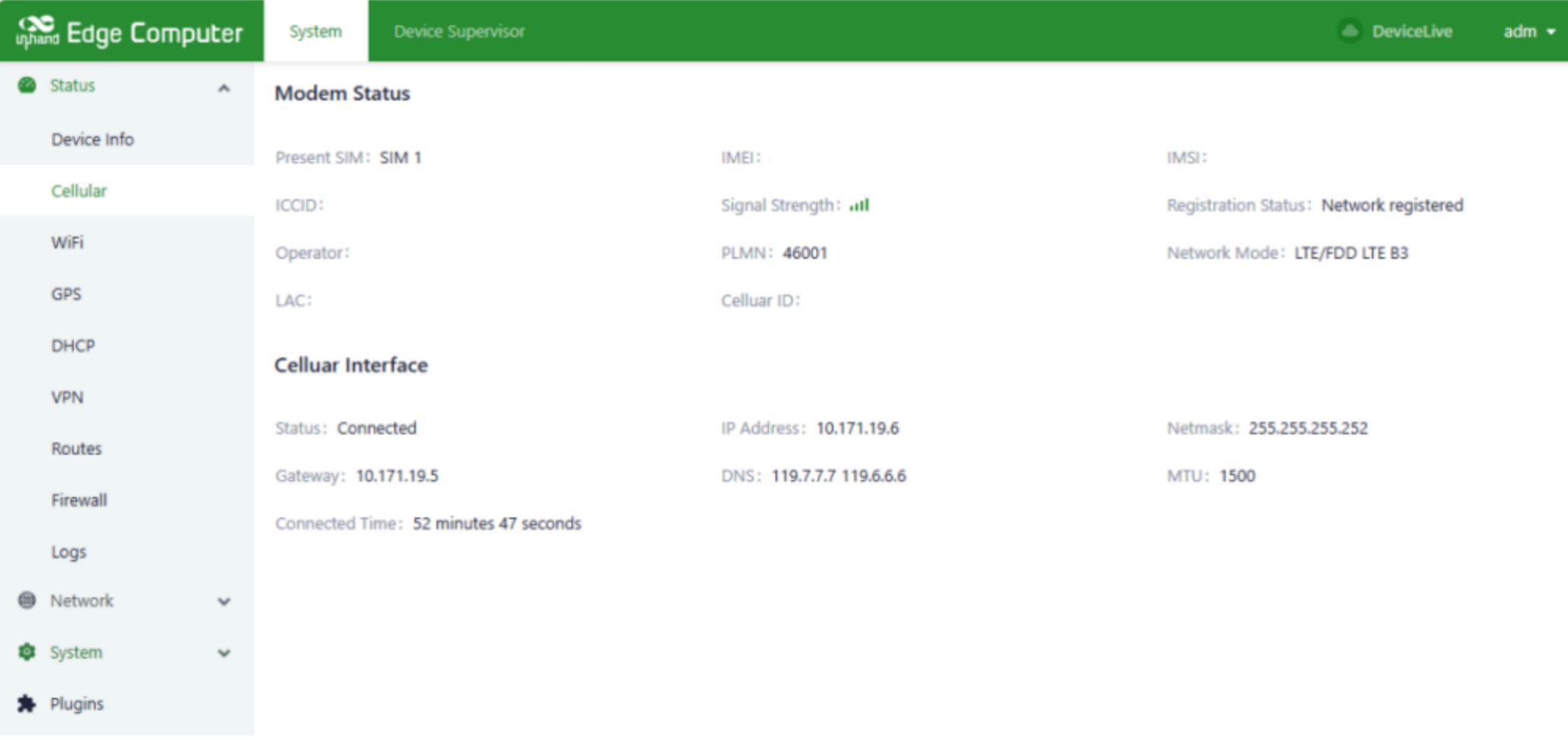 IEOS is a set of network management and system management programs running on the Linux system, developed by InHand, The IEOS provides a web interface, Users can take the Ethernet port ip address via the web, Cellular dialing, Wi-Fi Station, DHCP Client/Server, Static routing, Firewall and other network configuration; Can also be used for system time, time zone, Firmware upgrade and system restart operation; In addition, IEOS also supports DeviceLives equipment management platform DeviceLive, Users can remotely monitor and manage the EC5000 devices through the DeviceLive platform.