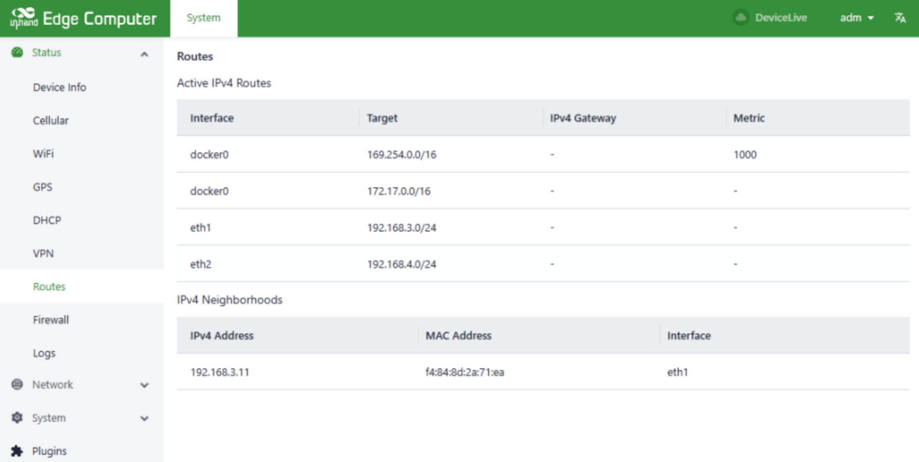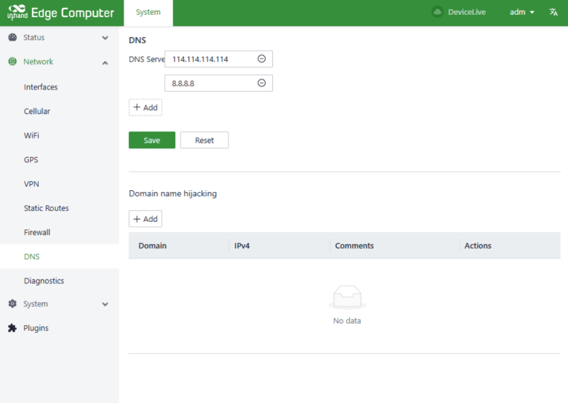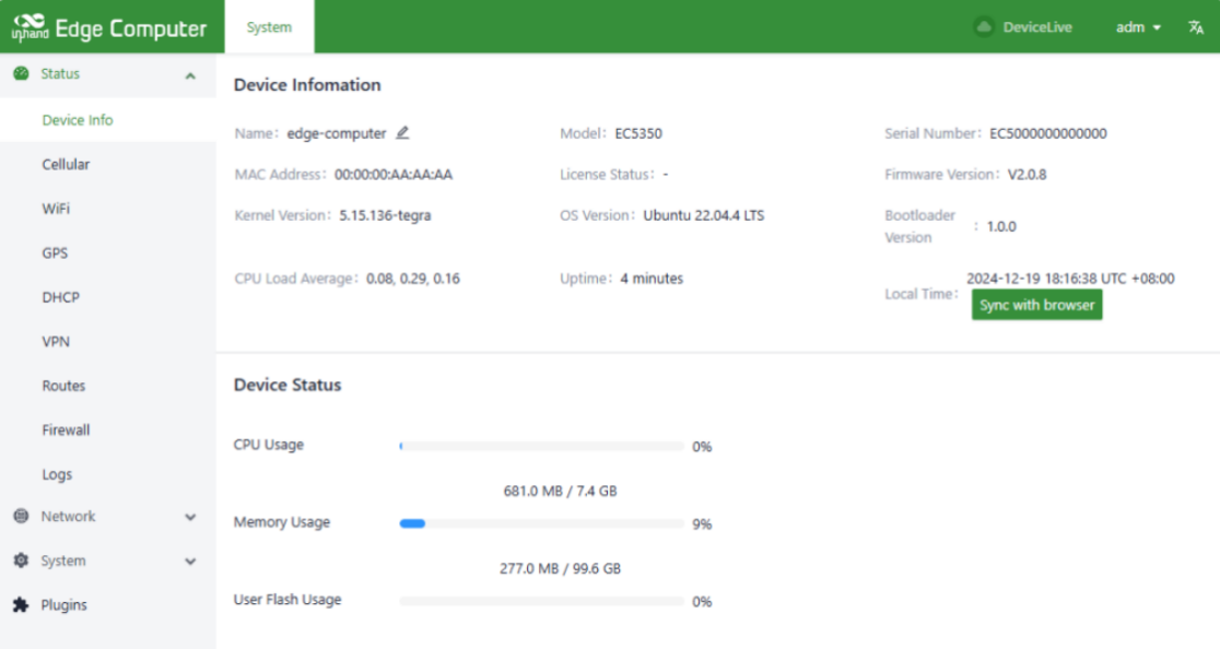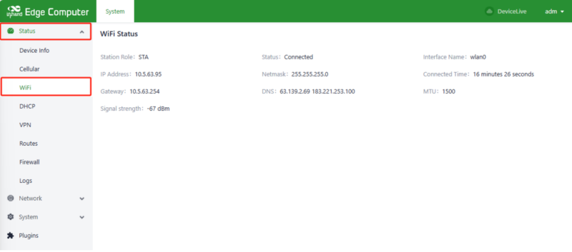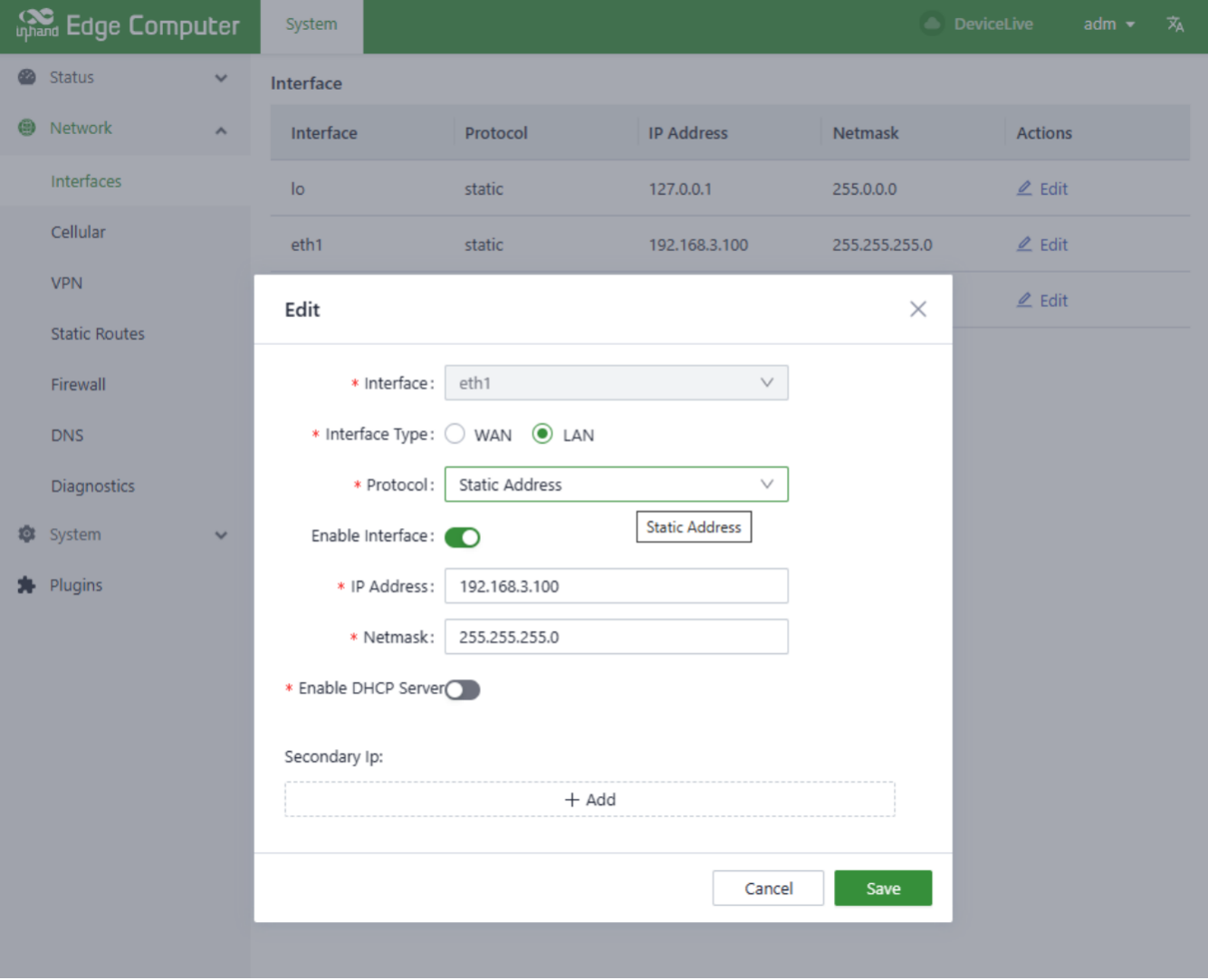IEOS is a set of network management and system management programs running on the Linux system, developed by InHand, The IEOS provides a web interface, Users can take the Ethernet port ip address via the web, Cellular dialing, Wi-Fi Station, DHCP Client/Server, Static routing, Firewall and other network configuration; Can also be used for system time, time zone, Firmware upgrade and system restart operation; In addition, IEOS also supports DeviceLives equipment management platform DeviceLive, Users can remotely monitor and manage the EC5000 devices through the DeviceLive platform.
