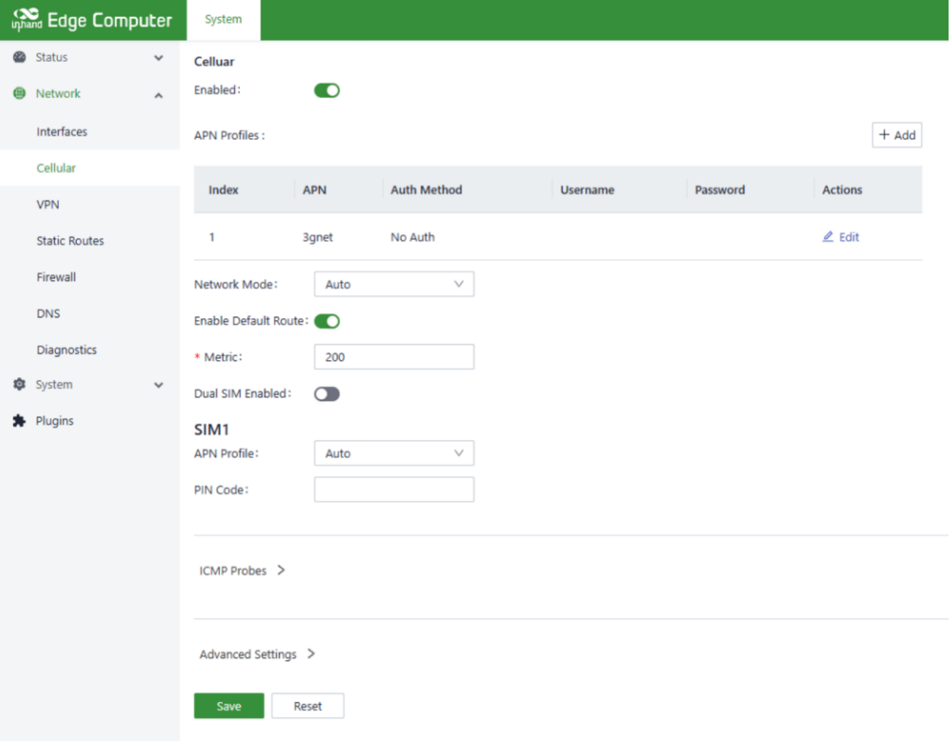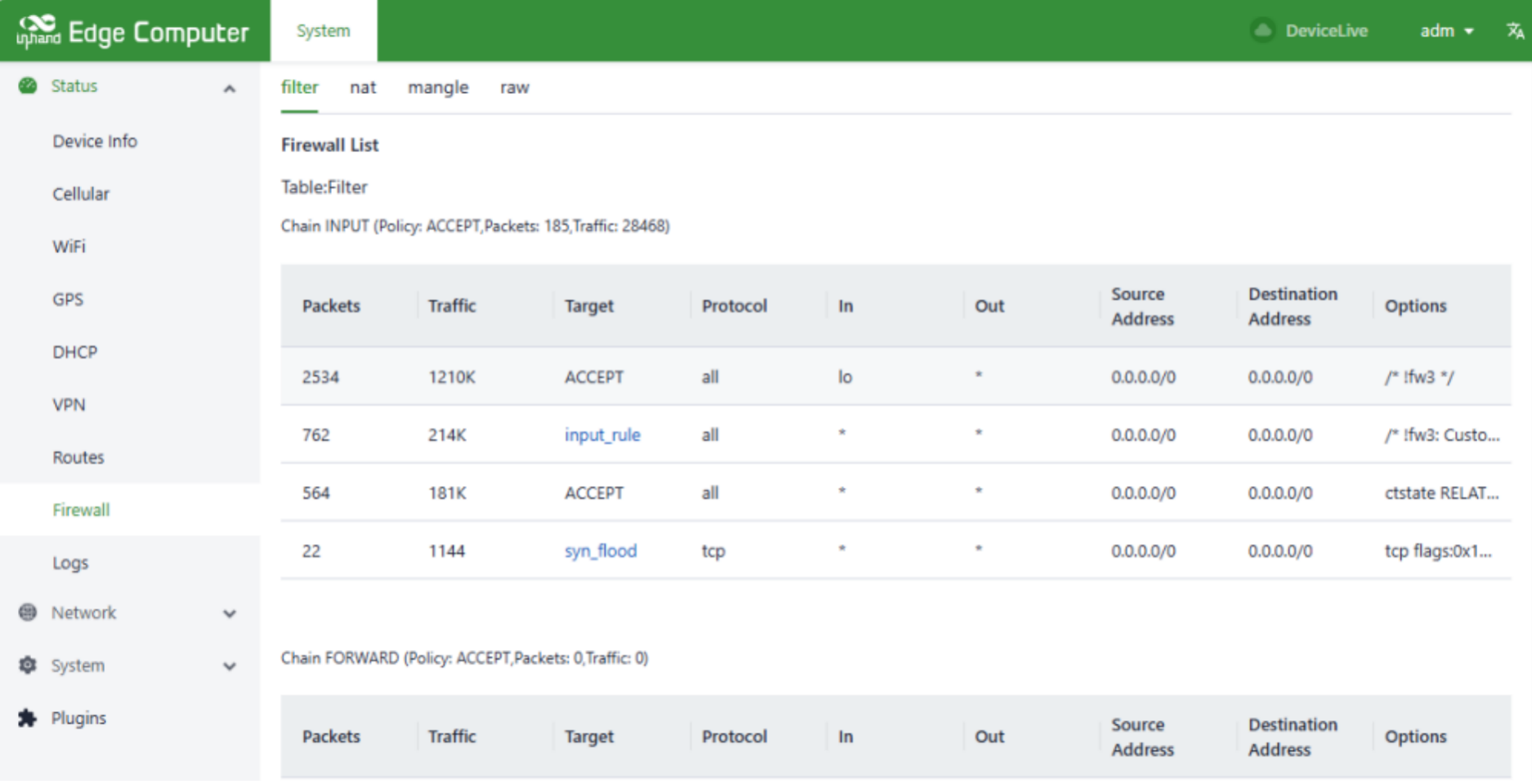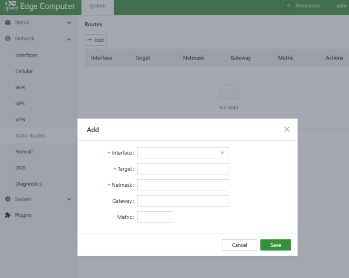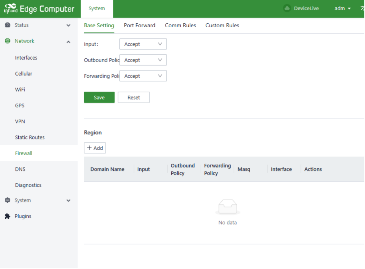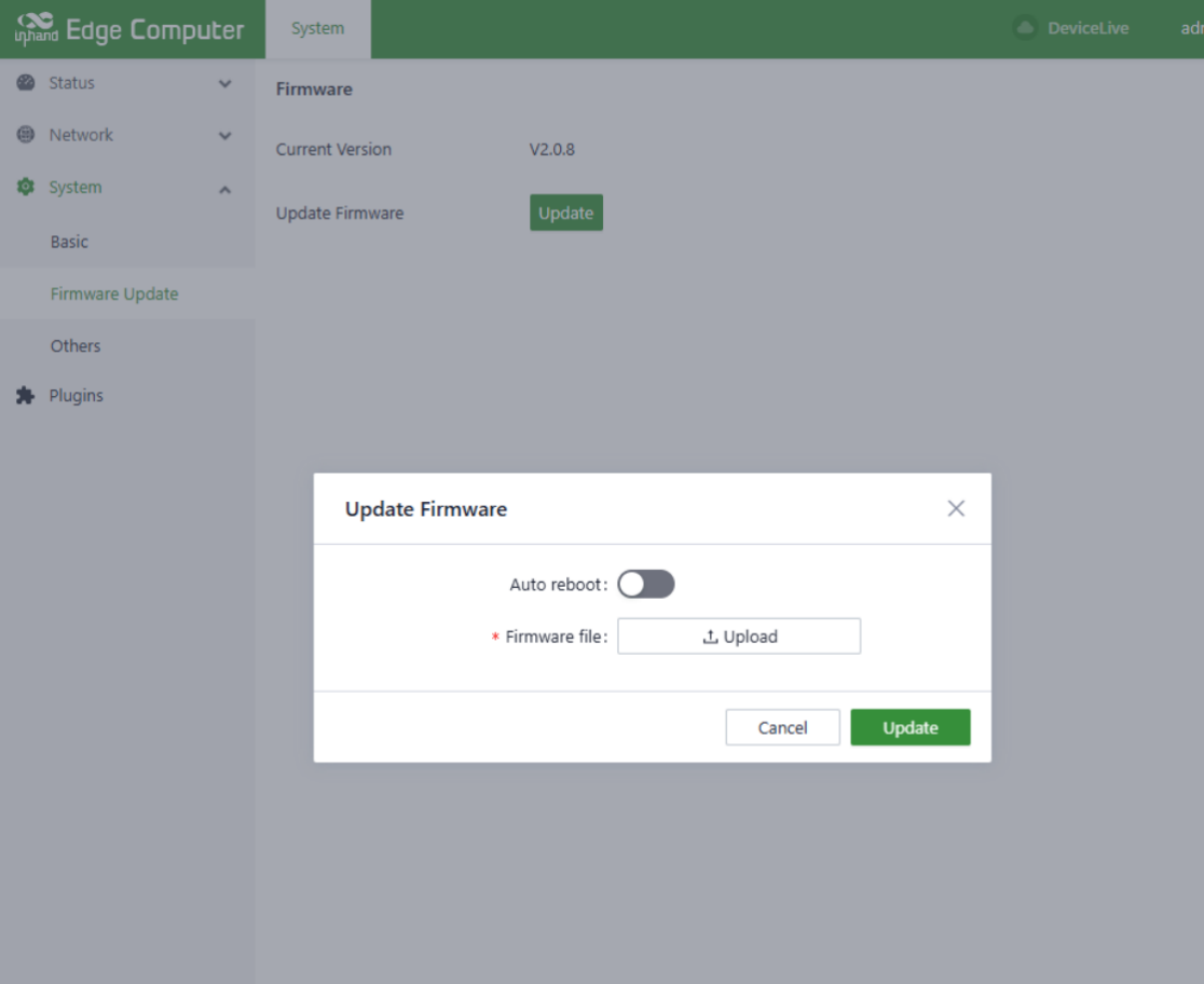 IEOS is a set of network management and system management programs running on the Linux system, developed by InHand, The IEOS provides a web interface, Users can take the Ethernet port ip address via the web, Cellular dialing, Wi-Fi Station, DHCP Client/Server, Static routing, Firewall and other network configuration; Can also be used for system time, time zone, Firmware upgrade and system restart operation; In addition, IEOS also supports DeviceLives equipment management platform DeviceLive, Users can remotely monitor and manage the EC5000 devices through the DeviceLive platform.