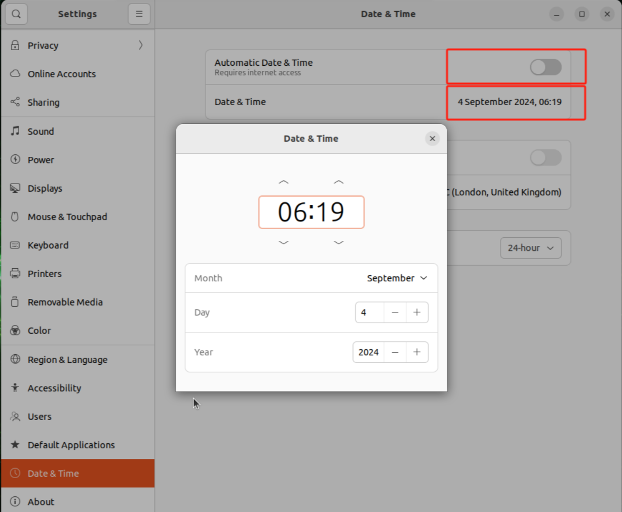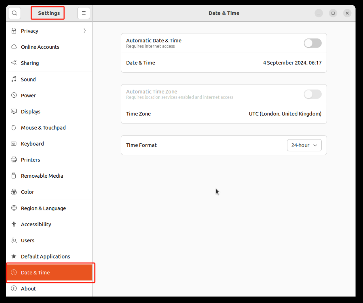 Click Show Applications->Settings->Data & Time at the bottom left corner of the desktop.