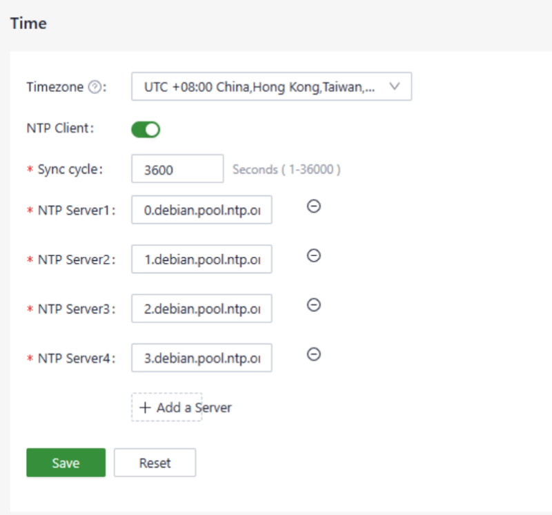 Up to 10 NTP Server addresses can be configured, and the program periodically sends synchronization requests to each server address. After successful synchronization, the system time is written to RTC and not sent to the NTP server.