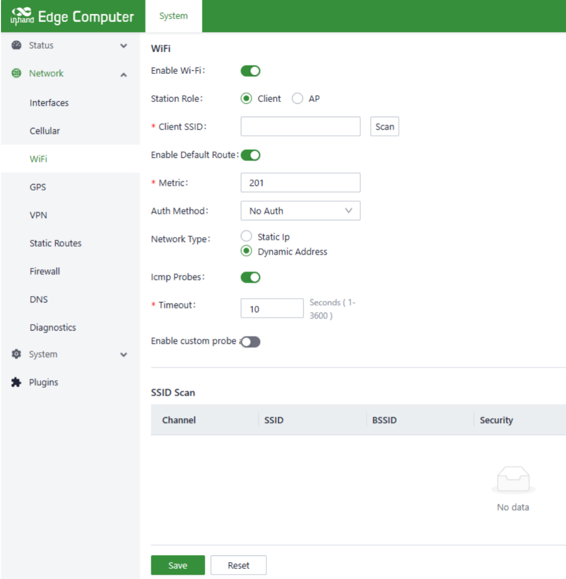 Client SSID: The ssid to be connected can be entered manually, or a nearby ssid through the scan button