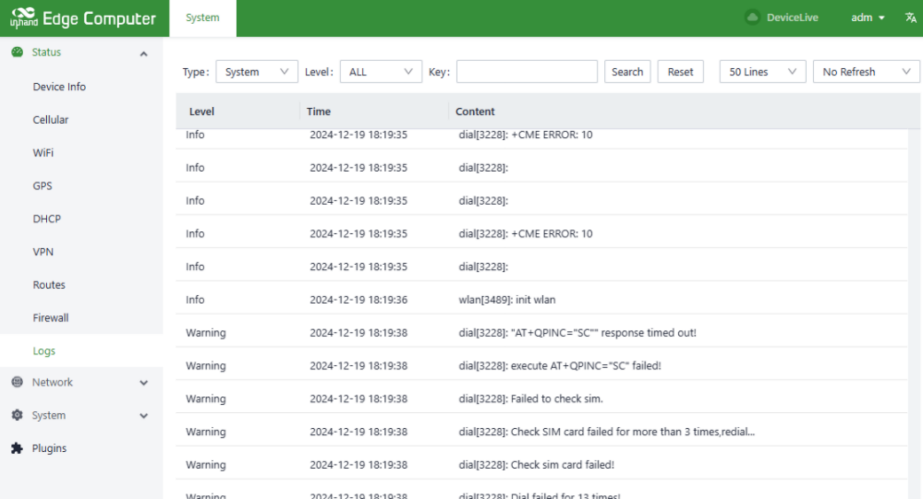 The log page can view the system logs, user logs, and set the viewing log levels, including Error, Info, Debug, and more. The logs can also be downloaded locally.