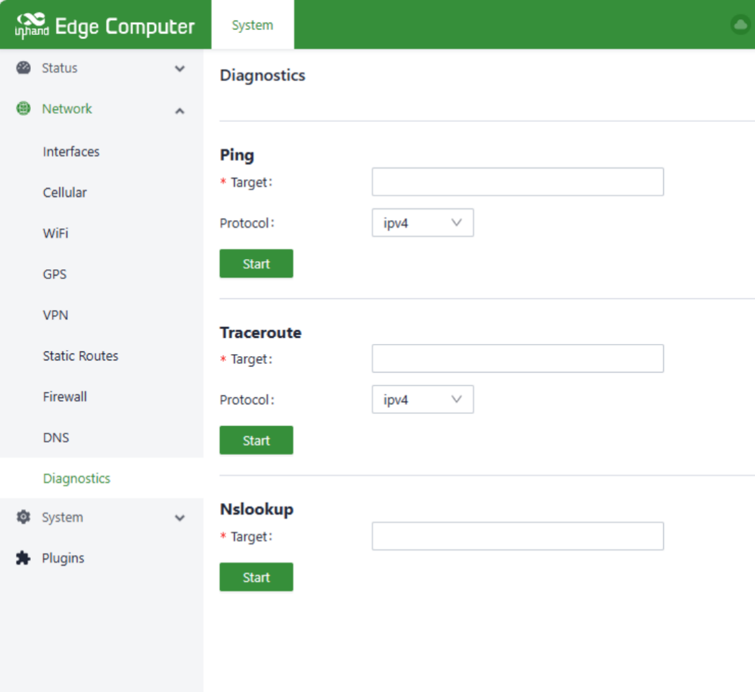 Network diagnosis supports ping, traceroute and nslookup functions.