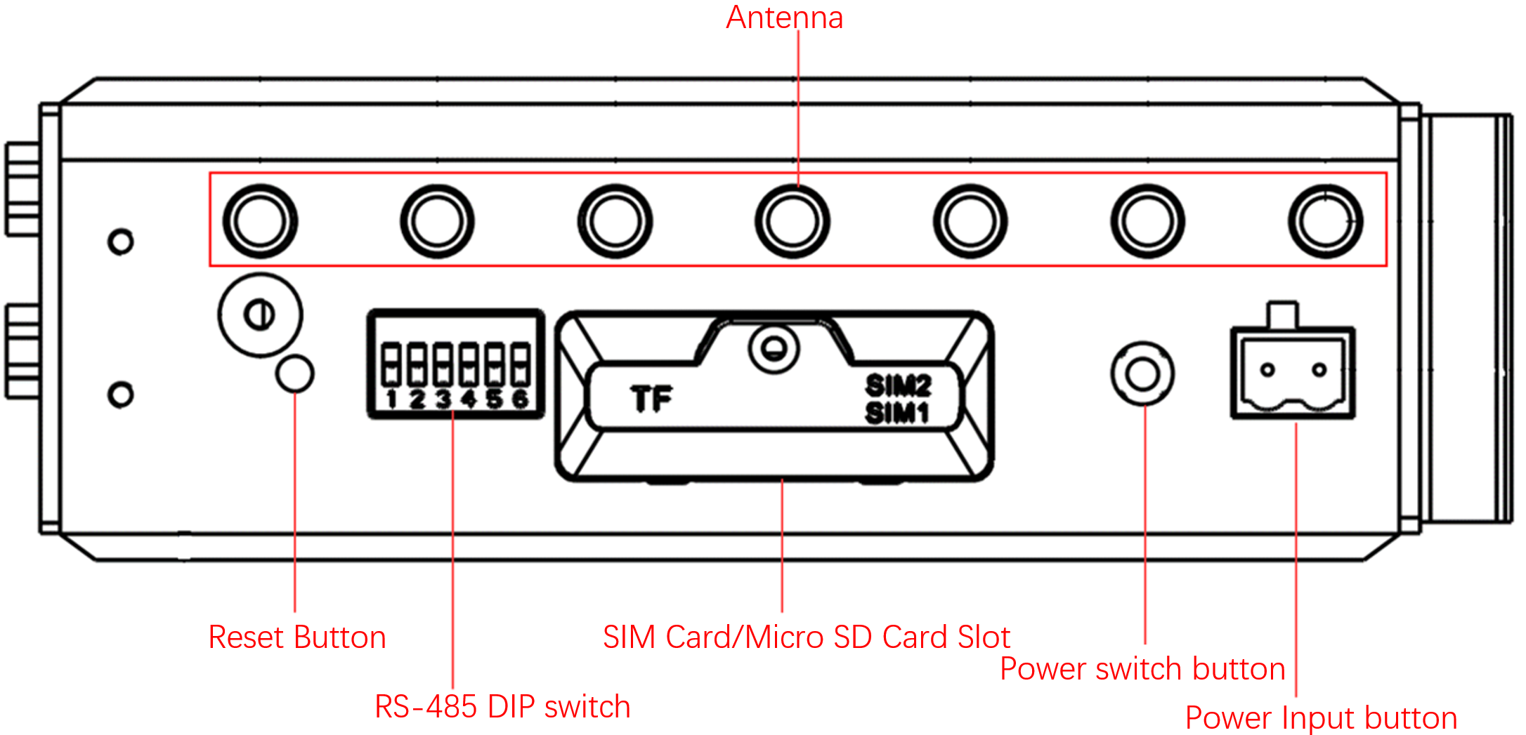 The product model shown in the figure is EC942-H-LQA8-B, which supports 7 antenna interfaces. Simply screw the required antenna into the corresponding SMA antenna interface to complete the antenna installation, as shown in ANT1.